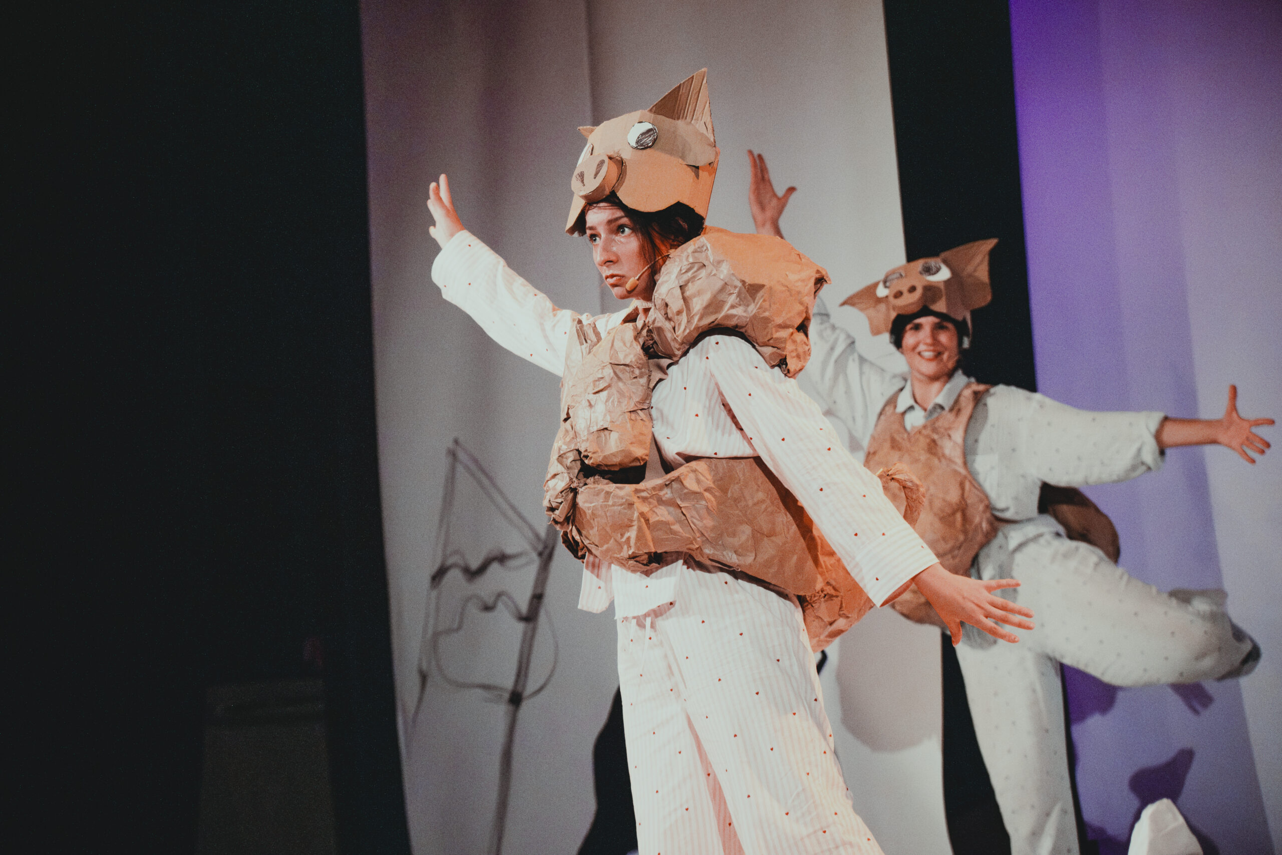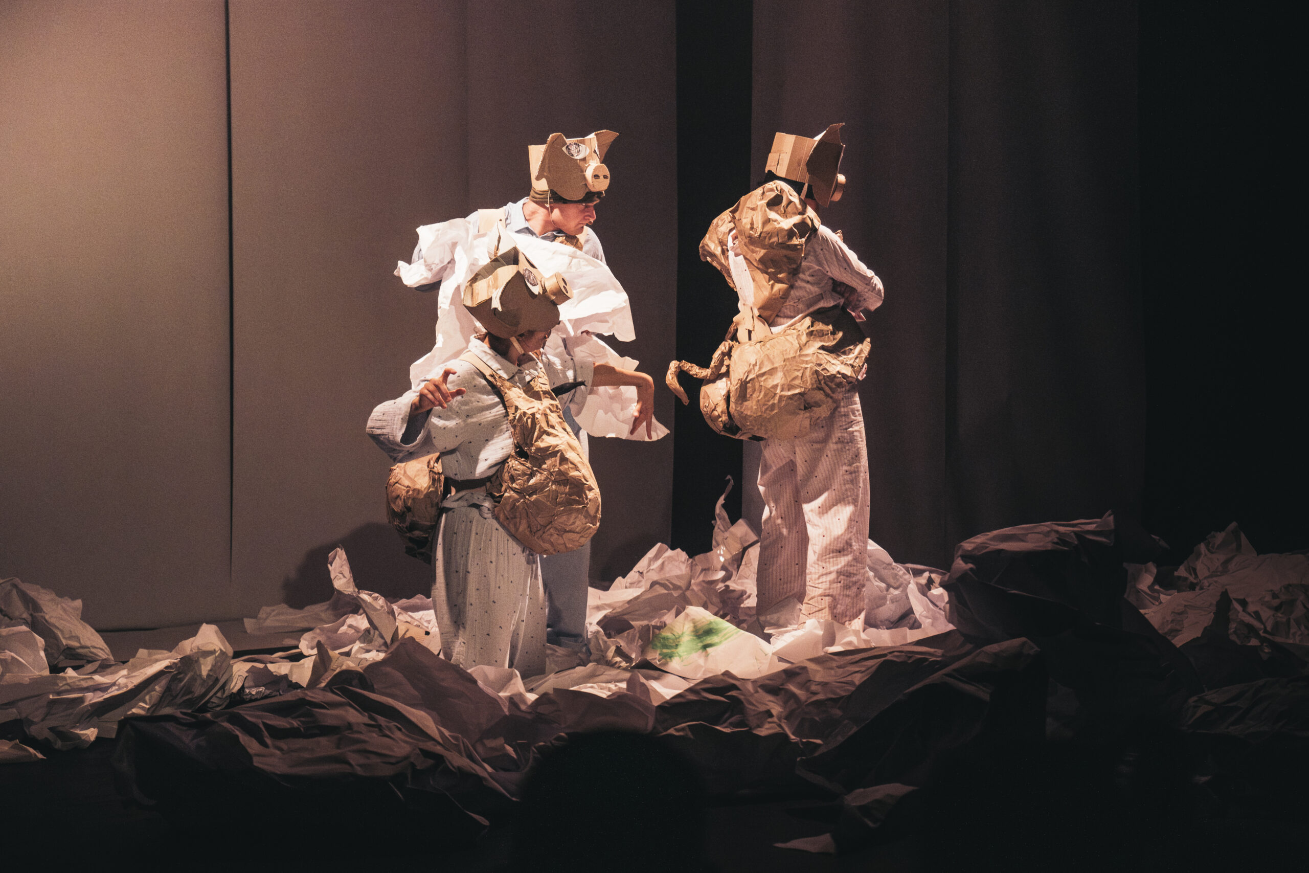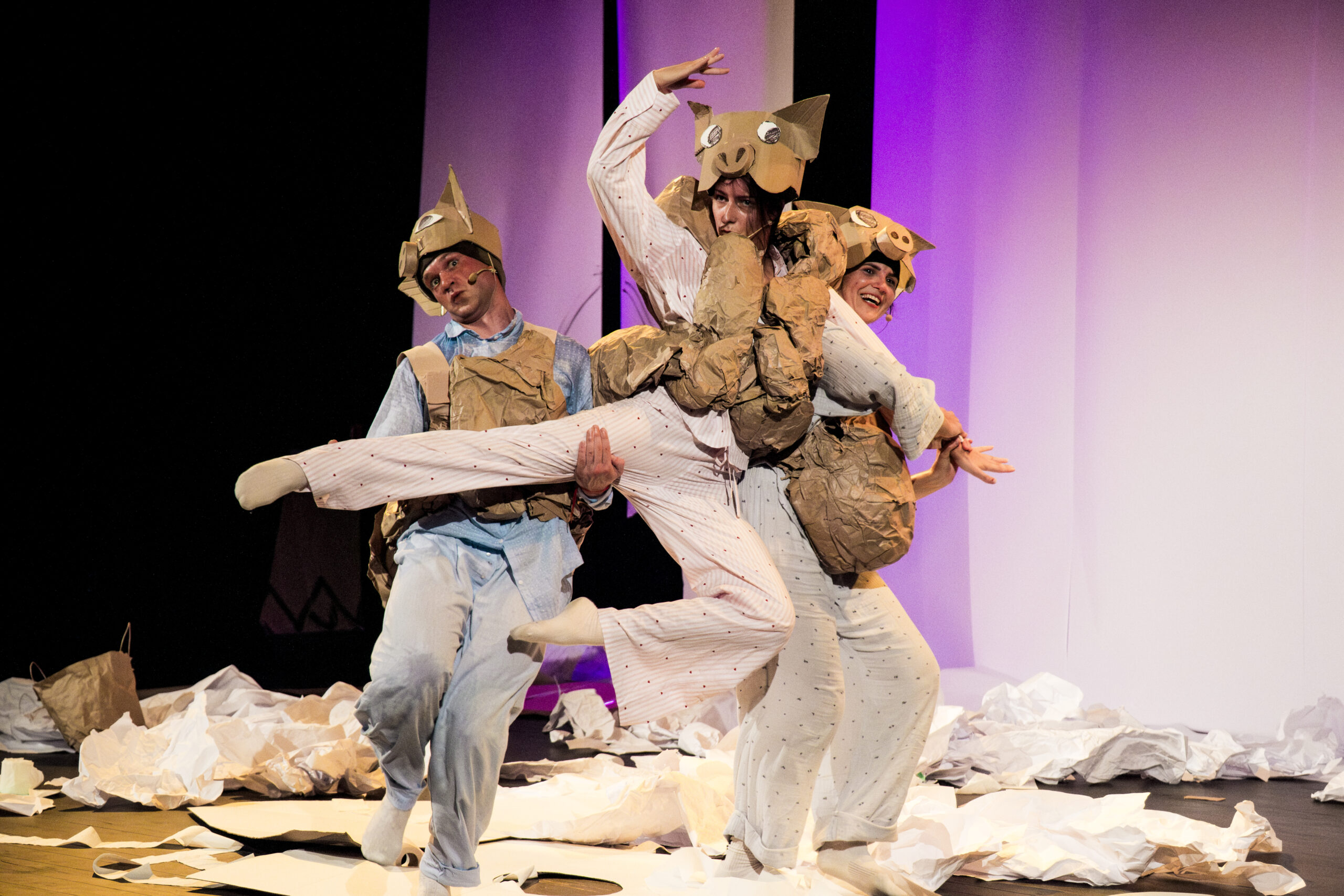 Naujausiame „Taško” teatro spektaklyje aktoriai kartu su vaikais kuria popierinį spektaklį pagal visiems žinomą pasaką „Trys paršiukai“. Sukurta pasaka čia pat suvaidinama aktorių: vaikai mato smagią, muzikinę istoriją apie draugystę, drąsą ir pagalbą vieni kitiems, o vaikus atydėję tėvai tuo tarpu vyksmą stebi iš šalies su ausinėmis ir girdi tik suaugusiems skirtą komišką vilko istoriją.