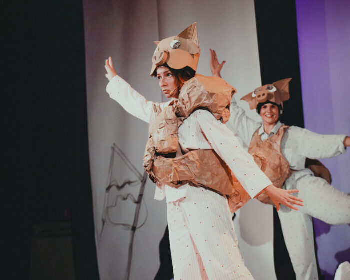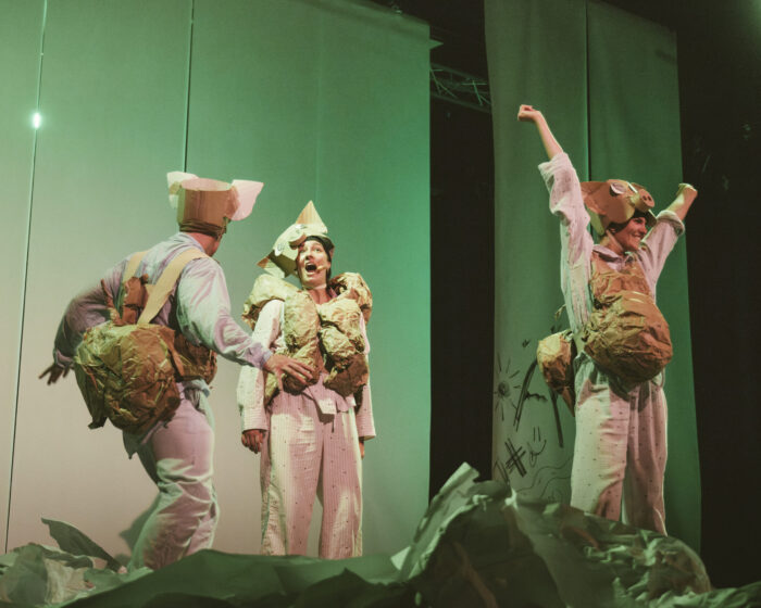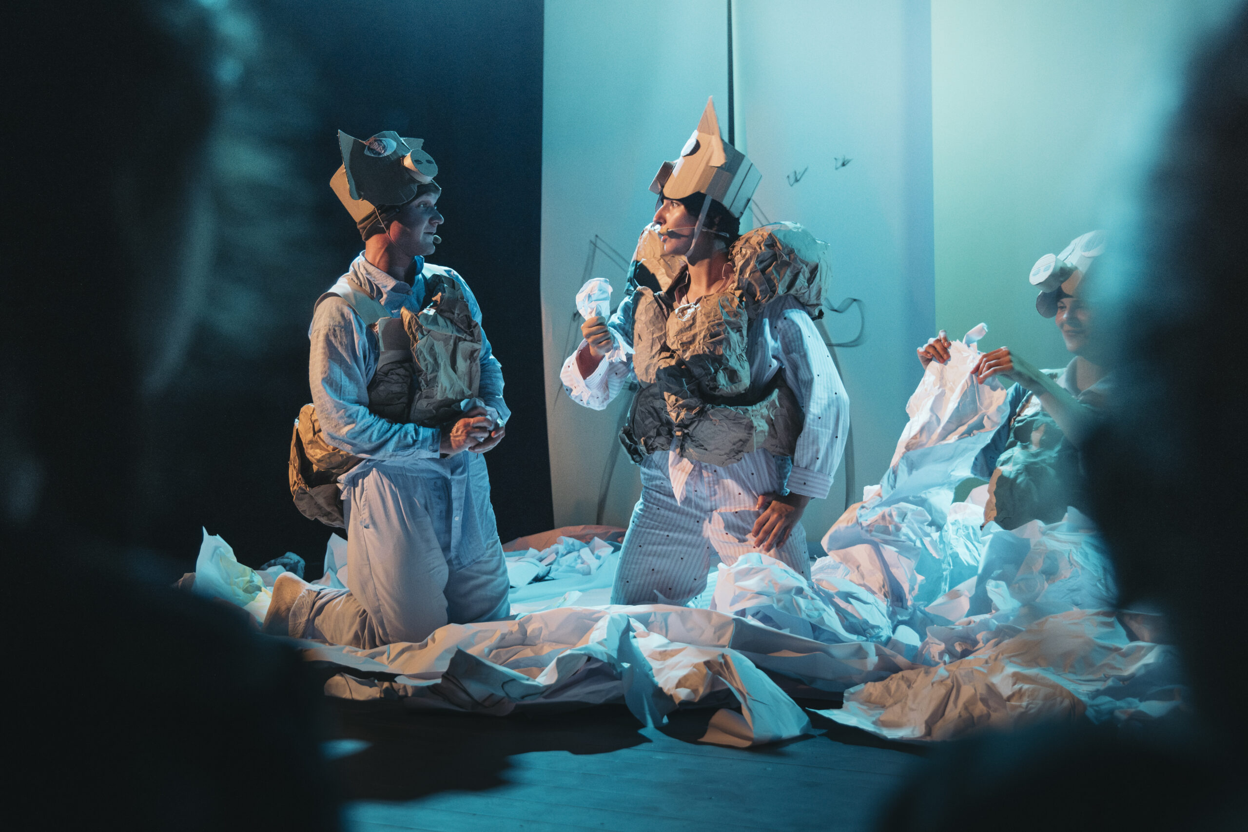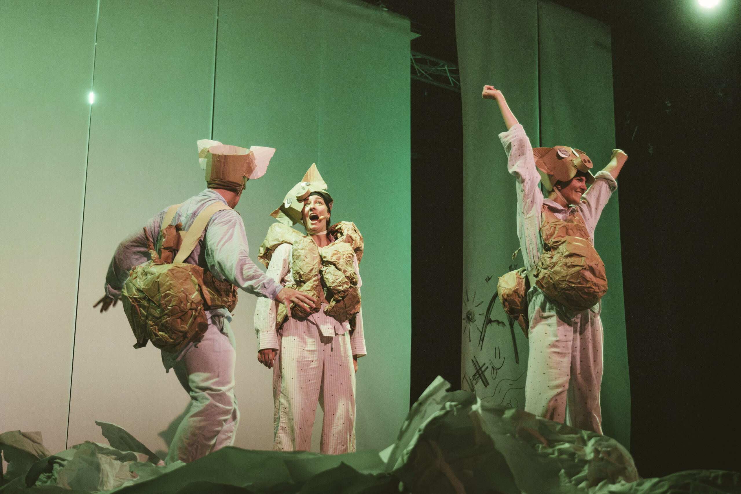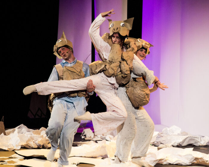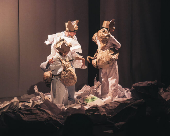 Naujausiame „Taško” teatro spektaklyje aktoriai kartu su vaikais kuria popierinį spektaklį pagal visiems žinomą pasaką „Trys paršiukai“. Sukurta pasaka čia pat suvaidinama aktorių: vaikai mato smagią, muzikinę istoriją apie draugystę, drąsą ir pagalbą vieni kitiems, o vaikus atydėję tėvai tuo tarpu vyksmą stebi iš šalies su ausinėmis ir girdi tik suaugusiems skirtą komišką vilko istoriją.